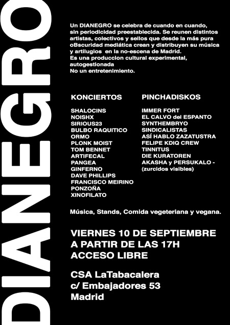 El DIANEGRO se celebrará este viernes 10 de septiembre a partir de las 17:00 en La Tabacalera de Lavapies en Madrid. DIANEGRO está en la linea de otras propuestas como Di no a la noche en blanco, una convocatoria desde la que hacer, por ejemplo, simulacros de sabotaje contra esta dudosa promoción cultural. En una ciudad que gasta 450.000 euros en celebrar el centenario de su Gran Via con actos tan bizarros como el enmoquetado de la calle durante un fin de semana, nadie se extraña que se gaste en unas horas cifras cercanas a los presupuestos anuales de centros como Medialab o Intermediae, que dependen de los mismos organismos. Y claro, todo esto da para hablar sobre el uso que está dando el ayuntamiento de Madrid a la cultura para legitimar su brutal política urbanística. En fin, estamos los que perdemos el tiempo escribiendo y los que pasan la tarde haciendo ruido.