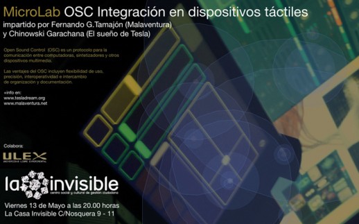 El Viernes 13 de Mayo, los audiovisualistas Chinowski Garachana de El sueño de Tesla y Fernando G. Tamajón impartirán un micro-taller sobre el protocolo OSC y su uso en dispositivos tactiles-moviles. Será el próximo 13 de Mayo, a las 20:00h dentro de las nuevas jornadas de Pulsion AV, encuentro entre experimentadores del medio visual y sonoro en La Casa Invisible de Málaga. Encuentros que se materializarán en performances audiovisuales, debates y talleres como este.