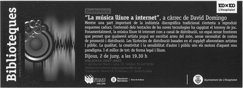 Mientras el proyecto acaba de concretarse, esta semana empezamos con la difusión a través de una charla sobre música libre en internet en la biblioteca y abierta a todo el mundo que quiera conocer un poco más sobre este mundillo. La idea es descubrir los conceptos básicos sobre música libre, internet, netlabels, plataformas, licencias a público neófito en el tema.