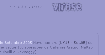 VIROSE is a non-profit organization dedicated to art and media technology based in Porto, Portugal. Normally is designated simply as an organization for the theory and practice of the old and the new media (Virose – art, theory, practice). It gathers artists, programmers, architects and others and runs a server with several areas, including an e-zine [http://www.virose.pt/vector] and free hosting areas. Since the beginning of the project, in 1997, the main question was to understand digital arts in the broader sense of art. The problems of net.art, digital art or whatever are no so different, and even less opposed, to the ontological question that put together (and apart) art and technic. Is it possible to speak about a plural of the arts without thinking also its singular? And is it possible to sustain the singularity of each art without its plural?