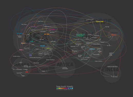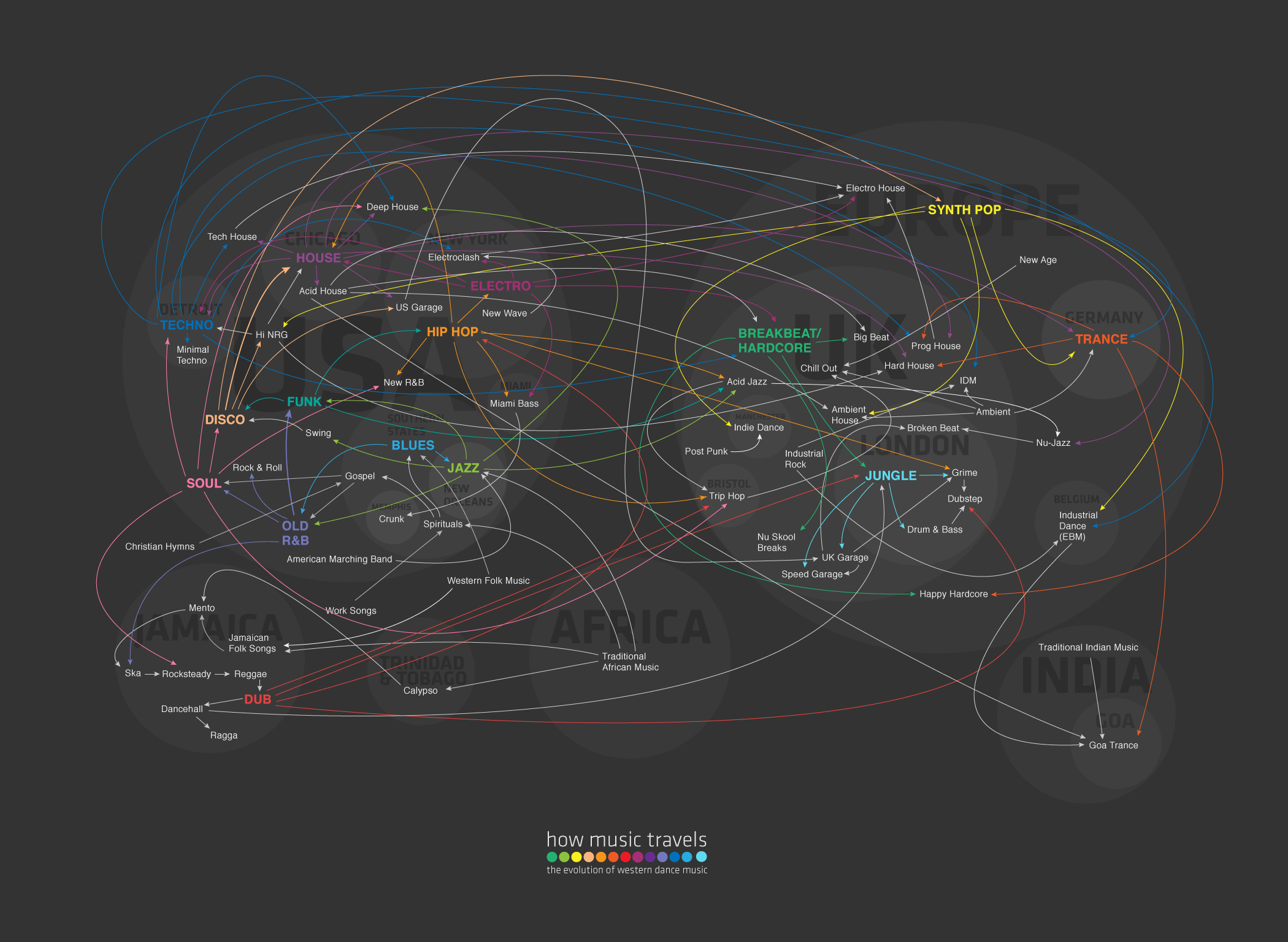Para animar a los turistas a hacer este tipo de viajes y que sepan bien adónde tienen que ir, se han tomado la molestia de crear un mapa interactivo, que curiosamente se centra en la evolución de la música occidental de baile – no sé si es que los roqueros, por decir algo, viajan menos. El mapa muestra dónde y cuándo nació cada estilo y cómo surgió el siguiente a partir de ahí. Podéis encontrar el mapa interactivo en este enlace.