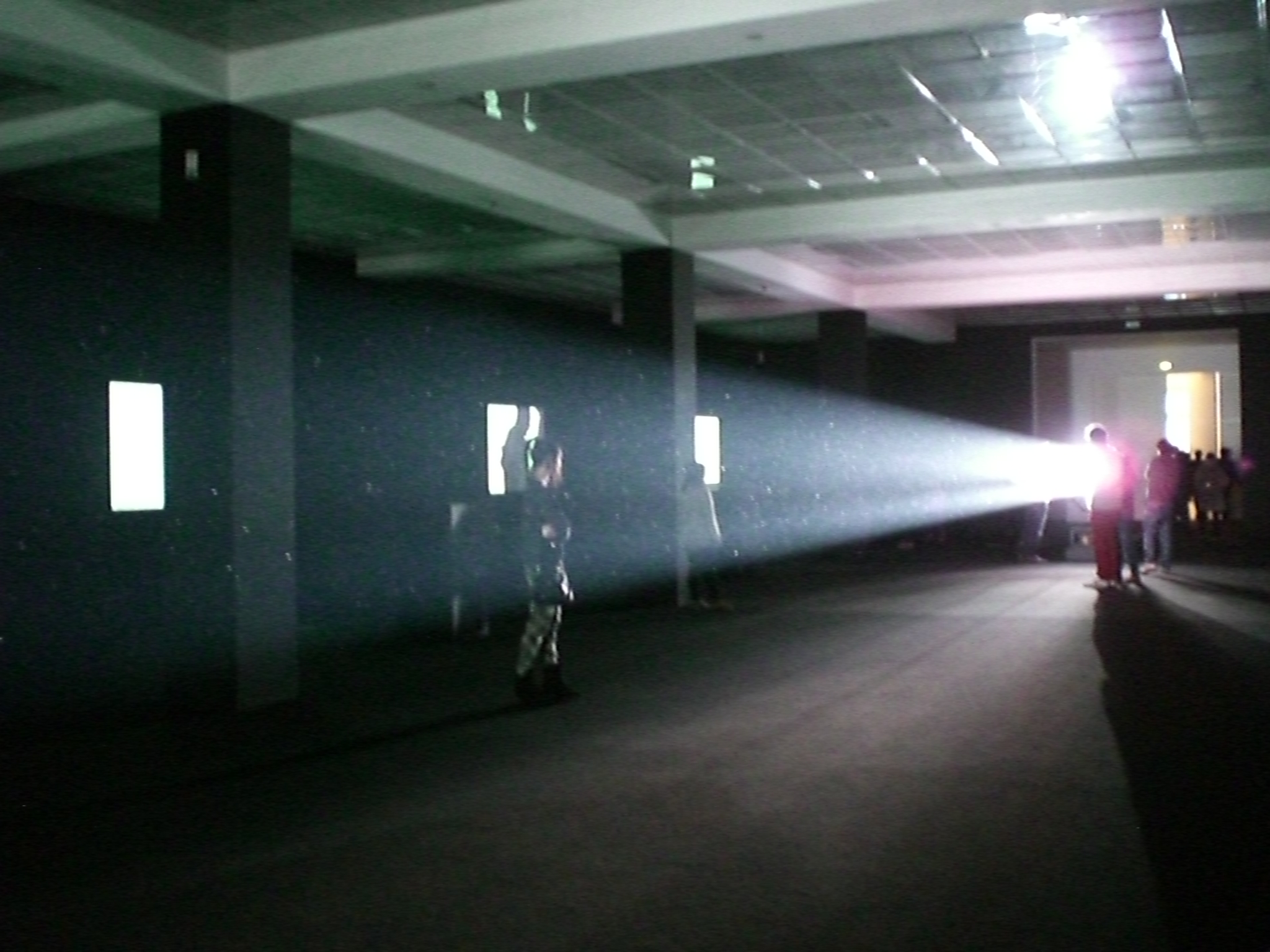 Este modo de esponer, sobrio, minimalista y monumental, creo que influye en cierto modo en los artistas que hacen instalaciones temporales. db de Ryoji Ikeda es un comentario sobre la simetría y la asimetría llevado a una expresión mínima y un efecto máximo. db ya había sido presentada como obra en el año 2000. En esta ocasión se presentaban dos salas longitudinales que ocupan cada uno de los brazos de la Hamburger Bahnhof, cada una identificada con un gran letrero en la entrada que hace un juego de palabras con la db de decibelio tales como «destruction-buid»,»design-basis» o «desk-bed». Una sala negra, otra blanca. Una con luz, otra con sonido. En la entrada de cada sala una lista de piezas que conforman la exposición/instalación, el mismo listado de obras en cada puerta.