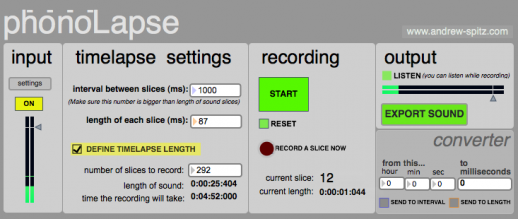 phonoLapse es una aplicación gratuita para Mac y Windows que permite crear time-lapses de sonido, es decir, grabaciones de sonido a intervalos de tiempo. A alguien se le ha ocurrido que si las fotos/vídeos hechos a intervalos de tiempo tienen tanto tirón, ¿por qué no fonografía a intervalos de tiempo? Esta idea tiene su origen en una pieza personal de Andrew Spitz, quien recibió tantos correos electrónicos preguntando por el proceso que decidió crear un software para que todo el mundo pudiese crear sus propios time-lapses sonoros.