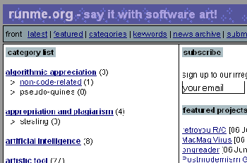 Runme.org is a software art repository, launched in January 2003. It is an open, moderated database to which people are welcome to submit projects they consider to be interesting examples of software art.