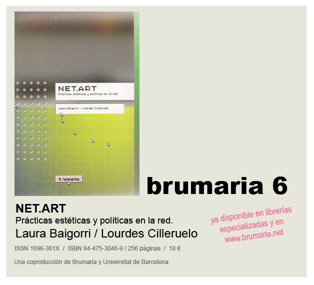 Laura y Lourdes están en el asunto del net.art desde el principio, si es que hubo algún principio, ahora que parece que el net.art es historia surge esta publicación, a ver qué tal. sólo por el prólogo ya se apuntan los contenidos de manera interesante. y brumaria, que es quien edita, pues siempre aporta un plus de garantía.
