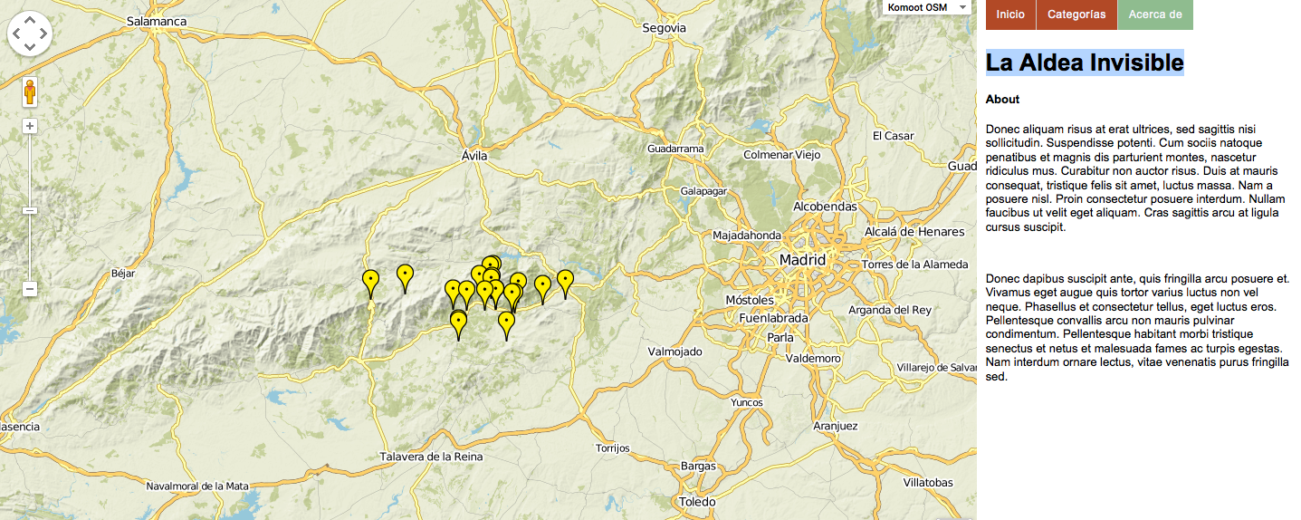 Este proyecto surge entre dos ríos, el Tietar y el Alberche, el sur y el norte de nuestro mapa. Propone una exploración usando el sentido del oído, como si se tratara de encontrar una mítica aldea, invisible, a la que no se puede llegar con la mirada.