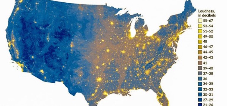 Craving some silence? Head (quietly) toward the blue regions on the map above. Based on 1.5 million hours of acoustical monitoring from places as remote as Dinosaur National Monument in Utah and as urban as New York City, scientists have created a map of noise levels across the country on an average summer day. After feeding acoustic data into a computer algorithm, the researchers modeled sound levels across the country including variables such as air and street traffic. Deep blue regions, such as Yellowstone National Park in Wyoming and the Great Sand Dunes National Park in Colorado, have background noise levels lower than 20 decibels—a silence likely as deep as before European colonization, researchers say.That’s orders of magnitude quieter than most cities, where noise levels average 50 to 60 decibels, scientists reported here today at the annual meeting of AAAS (which publishesScience). The National Park Service is using the map to identify places where humanmade noise is affecting wildlife—animals such bats and owls, whose ears are up to 20 decibels more sensitive than human ears, for example, are affected by humanmade noise because it drowns out the faint rustles of insects and rodents they need to hunt, they say.