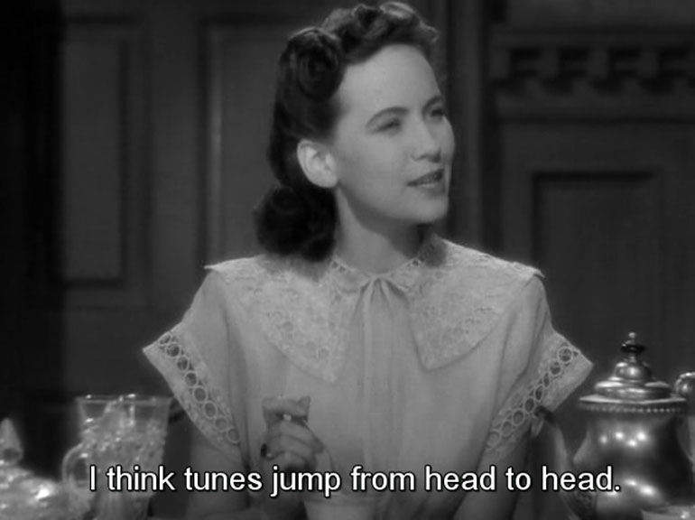 En este ejemplo, el gusano auditivo alude a la identidad secreta del tío Charles (asesino en serie de viudas), pero sobre todo sirve para subrayar la conexión entre Charles y su sobrina Charlie, que va mucho más allá de la comunicación verbal y gestual. La propia Charlie lo explica diciendo: «Imagínate que piensas en algo y que ese algo es sobre alguien con quien estás en sintonía. Entonces, a muchos kilómetros de distancia, esa persona sabe qué estás pensando y te responde. Y es todo mental». Aunque Charlie no está hablando de algo intrínsecamente musical, hace referencia a la resonancia entre cuerpos («someone you’re in tune with») y a la idea del intercambio entre psiques que plantea Szendy.