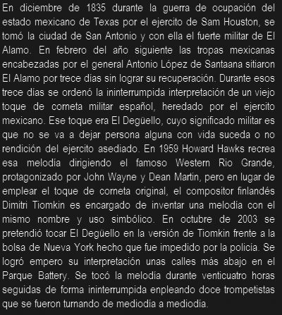 Fue a través de la historia del Álamo que el degüello llegó al contexto del artecuando Santiago Sierra trató de interpretar una versión de esta misma canción frente a la Bolsa de Nueva York en Octubre de 2003.