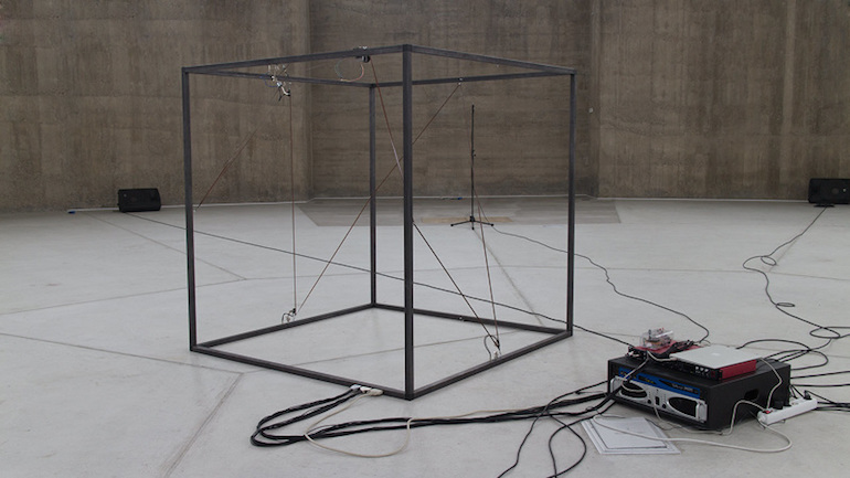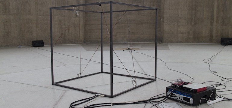 The cube is constructed out of thin steel tubes as a sturdy support for the magnetic tape loop. The magnetic tape is looped around the wheels that are fixed to the cube construction with elastic bands to keep the angle and the tension of the tape. A stepper motor is moving the tape around the wheels with constant speed. A system of play/record magnetic heads is connected to the cube construction. All of the connecting wires are hidden inside of the steel tubes of the cube. The sound of the surrounding space and the visitors is broadcast and recorded randomly on different parts of the looped tape making a constant feedback/delay loop that is gradually developing more and more.