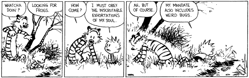 Alguien ha hecho este «remix» de una tira de Calvin and Hobbes (la original, que es prácticamente igual, pero sin grabaciones). Aunque yo no me dedico a las grabaciones de campo, a partir de ahora cada vez que alguien me pregunte por qué hago los vídeos que hago, contestaré que porque debo obedecer las inescrutables exhortaciones de mi alma…