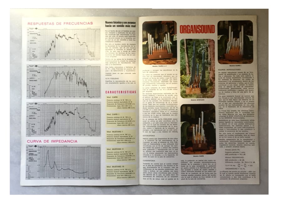 The Organsound has unusual acoustic characteristics, the original model can still be heard in the Yago Portela store, son of Juan Portela, in Santiago de Compostela, who describes it as follows: “The Organsound is a loudspeaker that achieves total separation of the sounds, both at an extremely low volume and very high, generating an enveloping and orchestral feeling in which no harmonics are lost or noises are introduced. Every tube has a dimension that corresponds to a frequency range. It is as if each of these frequencies found a suitable way to expand. ”