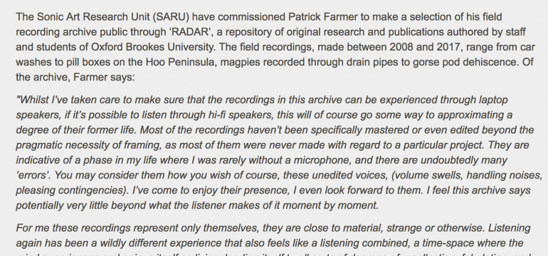 The Sonic Art Research Unit (SARU) have commissioned Patrick Farmer to make a selection of his field recording archive public through ‘RADAR’, a repository of original research and publications authored by staff and students of Oxford Brookes University. The field recordings, made between 2008 and 2017, range from car washes to pill boxes on the Hoo Peninsula, magpies recorded through drain pipes to gorse pod dehiscence. Of the archive, Farmer says: