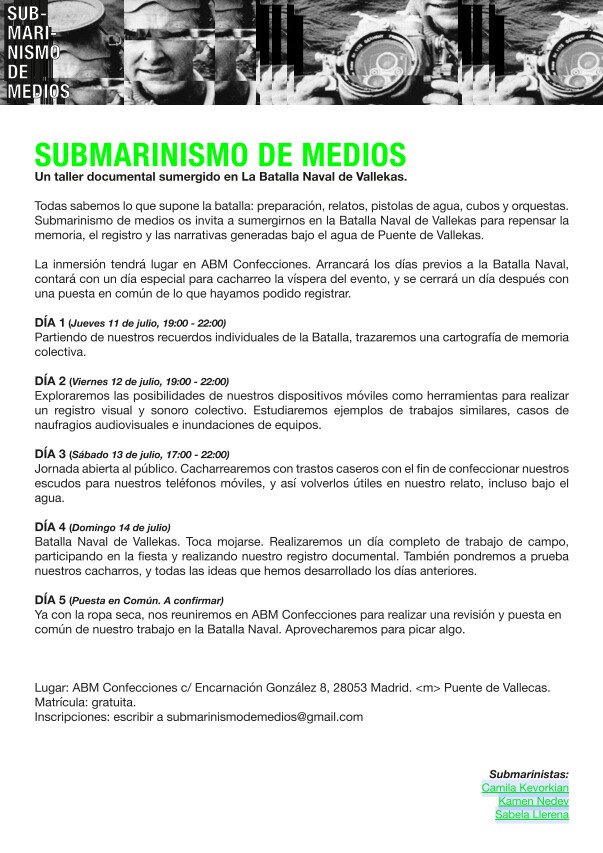 Todas sabemos lo que supone la batalla: preparación, relatos, pistolas de agua, cubos y orquestas. Submarinismo de medios os invita a sumergirnos en la Batalla Naval de Vallekas para repensar la memoria, el registro y las narrativas generadas bajo el agua de Puente de Vallekas.