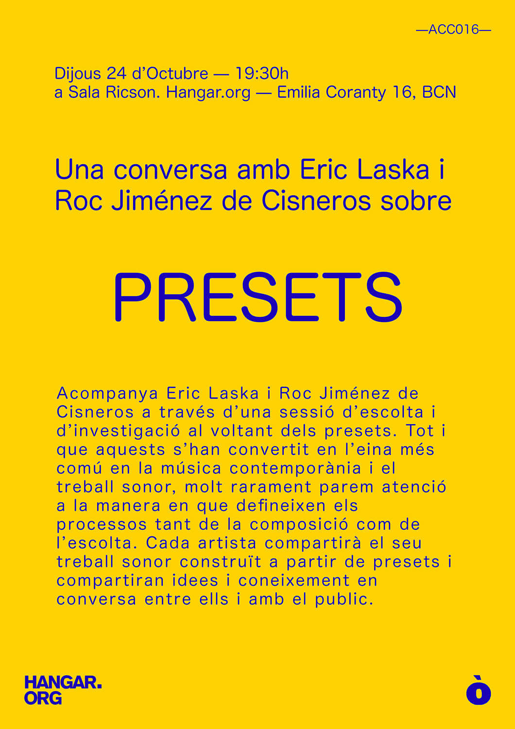 El 24 de octubre a las 19:30 h Hangar acoge Presets, la tercera actividad programada por Anòmia y coordinada por Arnau Sala para Audio Formal. Un encuentro para acompañar a Eric Laska (US) y a Roc Jiménez de Cisneros (ES) a través de una sesión de escucha y de investigación en torno a los presets.