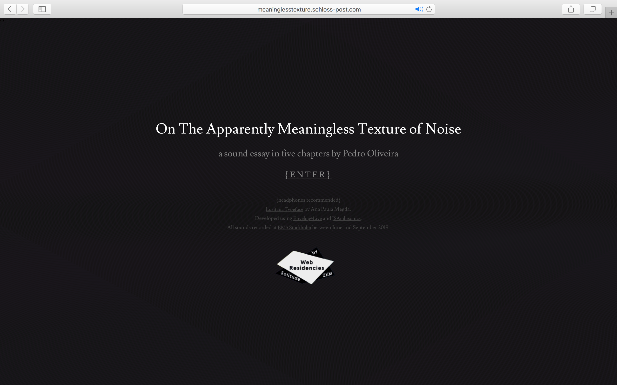 20 diciembre 2019 On the Apparently Meaningless Texture of Noise Written by Mikel R. Nieto Mediateletipos arte sonoro, artistas, internet Leave a Comment «On the Apparently Meaningless Texture of Noise« by Pedro Oliveira. > Interview Compartir
