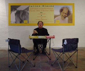 Après sa sortie de cinquantaine en 1992 et de soixantaine en 2002, Julien Blaine revient à la galerie Lara Vincy pour présenter un ensemble de photos et d’objets en relation avec plus de quarante années de performances. A cette occasion, présentation de Bye-bye la perf. [livre + CD + DVD], coédition Al Dante & Adriano Parise.