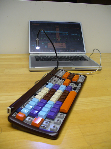 The big idea behind the keyboard is that the humble QWERTY keyboard offers a ton of control possibilities, thanks to the flexible keymapping capabilities of Ableton Live. I’ve been using the built-in keyboard on my Powerbook for a while now to trigger clips in performance, but it’s tough for a couple reasons. First, it looks like you’re writing e-mail during a show, and that’s kinda boring. Second, all the keys look the same (minus the markings, of course) – there’s not much that lets you navigate easily in low-light conditions and in the heat of the moment on stage.