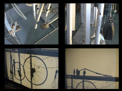 Instalación mecánica de apariencia rudimentaria que mediante objetos variados e inconexos, que rozan y chocan unos contra otros, genera un escenario sonoro y visual muy interesante y lúdico.