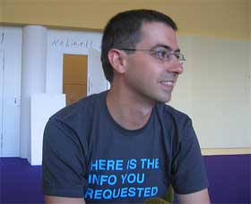 Not for him apparently. Not only does he wear great t-shirts*, he also collaborates with UBERMORGEN and Paolo Cirio on artistic projects which have toured the world: GWEI – Google Will Eat Itself (Honorary Mention Prix Ars Electronica 2005, Rhizome Commission 2005, nomination Prix Transmediale 2006) and Amazon Noir (1st prize Stuttgarter Filmwinter 2007, Honorary Mention Share Prize 2007).