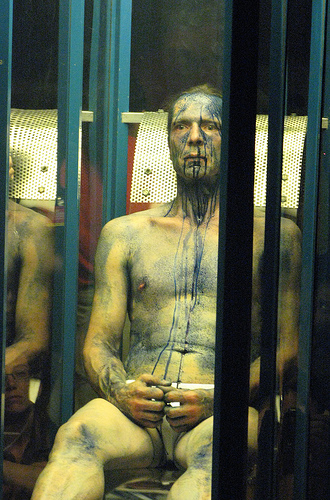 el pobre recibió unos cuantos flashazos de algunos irrespetuosos individuos con sus cámaras pegadas al cristal ya con las luces apagadas tras acabar la performance, mientras desalojabamos y él se recuperaba y se limpiaba ahi dentro tras el esfuerzo llevado a cabo.