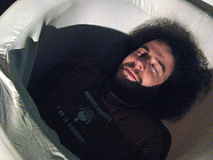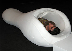Este trabajo es parecido a Sonic Bed, otro proyecto similar desarrollado por Kaffe Matthews, que por cierto también se llevó una distinción en la categoría Digital Musics en el 2006. Pude experimentar este otro proyecto recientemente en una exposición en Amsterdam en Julio, y aunque sus aproximaciones al ‘sonido tactil’ son algo distintas, la Sound Capsule me gustó casi más en esta primera escucha al resultar en una experiencia diría que más inmersiva e íntima, mientras que en la Sonic Bed las vibraciones recibidas en el cuerpo eran mucho más pronunciadas. Un factor que las diferencia es que en este caso la escucha es totalmente individual, mientras que en la Sonic Bed caben varias personas. Aunque solamente probé la capsula una vez (durante 4 minutos, lo que dura la escena sonora del paseo en bici), me sentí realmente inmerso en ella y por un momento sentí mi respiración sincronizarse con esa que estaba escuchando en la grabación; esta experiencia sonora me recordó también al trabajo 5000mNewWR publicado por AS11 en el sello griego Antifrost en 2001.