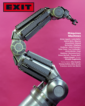 Rosa Olivares, directora y editora de EXIT, en su editorial Máquinas sensibles, reflexiona, repasando la iconografía cinematográfica del robot, sobre cómo la máquina no sólo simboliza los miedos del hombre a la despersonalización sino también sus deseos de perfección. Francisco Javier San Martín, profesor de Historia y Teoría del Arte en la Universidad del País Vasco, traza en su artículo, La máquina y su sombra, una historia de la forma en que las vanguardias se apropiaron de la máquina como metáfora de la modernidad. Miles Orvell, catedrático de Literatura Inglesa en Temple University y reconocido experto en la historia de la fotografía, examina el uso que la fotografía actual ha dado a la representación de las máquinas. Cierra el número el texto de Elio Grazioli, profesor de Historia y Teoría de la Fotografía en la Università di Bergamo, que parte de la famosa frase de Andy Warhol «Quiero ser una máquina» para indagar sobre la relación que han mantenido los fotógrafos contemporáneos con la propia máquina fotográfica y el concepto de automatismo que podría asociársela.