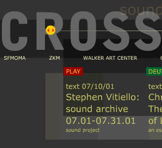 «CROSSFADE focuses on sound as artistic medium. The purpose of this ongoing project is to contextualize and facilitate access to a diversity of sonic and musical directions, which utilize network technology as an integral part of their production. A curated space, CROSSFADE spans different aesthetic points of departure and integrates visual works with sonic constituents. New approaches towards the specific properties and artistic potential of networks as time-based technology will be at the heart of CROSSFADE, which aims at becoming a meeting-point for artists as well as audiences whose paths rarely cross, be it locally or globally, aestethically or sociologically […] CROSSFADE is a joint project of the San Francisco Museum of Modern Art, the Goethe-Institut, ZKM (Center for Art and Media, Karlsruhe) and the Walker Art Center (Minneapolis). It is funded in part by the James Family Foundation.»