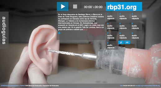 rbp31 (Radio Bienal Pontevedra XXXI) ofrece un juego para el oído al interferir en el medio radiofónico tradicional. Lo hace poniendo de manifiesto sus posibilidades expresivas e inherentes, propias de ese medio, aunque expandiendo su lenguaje normalizado y previsible; interfiriendo en él. Un proyecto de Escoitar.org para la oreja liberado del corsé de la escritura y entregado a la realidad sensible, aquella que se manifiesta a través de la vibración de los cuerpos y objetos.