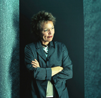 Laurie Anderson (born 1947) rose to acclaim on the New York art scene of the early 1980s with her distinctive electronic performances, and continues to be a major globally active artist, one the very few truly international stars of performance art today. Utilizing synthesizers, video and computer graphics as well as various electronic devices of her own design, she blends diverse elements – music, moving images, language, action – into eclectic cocktails of experimental ideas and avant garde modes of expression that appeal to a broad popular audience. She is, in a word, the very embodiment of colorful postmodern performance. Recently invited to become the first ever Artist-in-Residence at NASA, she created a new performance piece under their auspices. She is also currently showing an installation-video-performance work in a Japanese garden as part of Expo 2005 Aichi. Indeed, her keen creative energies seem inexhaustible. The present exhibition was produced by the Musee d’Art Contemporain de Lyon, after which it toured to Dusseldorf, Milano and Dublin before coming here. Comprising some ninety pieces – everything from early works steeped in the conceptualism of the 1970s, to videos, assemblages, installations and original violins, tophotos and drawings right up to projects for Expo 2005 Aichi – the exhibits span an artistic career of over thirty years, making this a real retrospective show, and for many of us here in Japan, a prime opportunity to take in the full scope of her multi-disciplinary, multi-media pursuits.