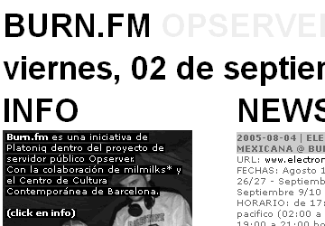 BURN.FM actúa como una plataforma on y off line creando puentes entre la net-cultura, la club-cultura y la street culture. Cada uno de los programas de Burn.fm explora diferentes facetas de la radio experimental musical, la música electrónica independiente y la música de derechos libres, desde la actitud del ‘hazlo tú mismo’ y la filosofía de la cultura libre. Este nuevo canal en Internet combina el formato del audioweblog, con los programas en directo de colaboradores locales e internacionales