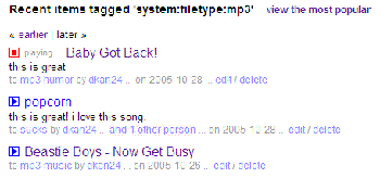 La gente de del.icio.us. esa revolución que te permite saber, por ejemplo, qué mesa se ha comprado tu socio teletipero, o qué es lo último en el mundo del videoclip, permite ahora escuchar los mp3 desde la propia página. Lo cuentan en su blog