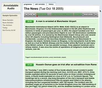 «…The project we undertook was focused on Annotatable Audio (specifically, but not exclusively, of BBC radio programming) – and we decided to look in an unorthodox direction – towards the possibilities of user-created annotation and metadata. We decided that we wanted to develop an interface that might allow the collective articulation of what a programme or speech or piece of music was about and how it could be divided up and described. Our first ideas looked for approaches similar to del.icio.us, Flickr or our own Phonetags – which create collective value by accreting the numerous annotations that individuals make for their own purposes. But after a fascinating discussion with Jimmy Wales, we decided to think about this in a different way – in which (just like Wikipedia) individuals would overtly cooperate to create something greater and more authoritative…»