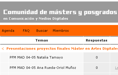 Hoy comenzarán las presentaciones en público de los Proyectos Finales de la 8ª edición del Master en Artes Digitales (IDEC-IUA-UPF) curso académico 2004-2005.