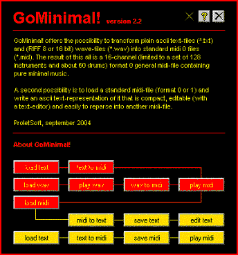GoMinimal! offers you the possibility to transform plain ascii text-files (*.txt) and (RIFF 8 or 16 bit) wave-files (*.wav) into Standard Midi 0 Files (*.mid). The result of this all is a 16-channel (limited to a set of 128 instruments and about 60 drums) format 0 general midi-file containing pure minimal music. A second possibility is to load a standard midi-file (format 0 or 1) and write an ascii text-representation of it that is compact, editable (with a text-editor) and easily to reparse into another midi-file.