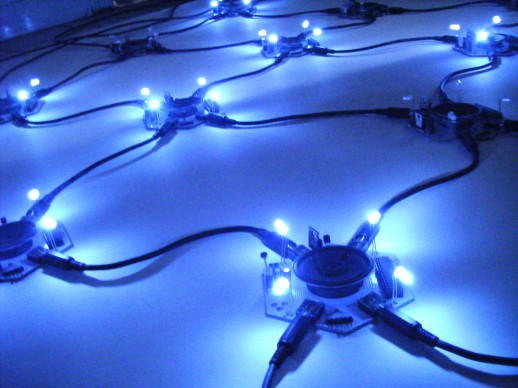 sonoro-lumínica generativa inspirada en teorías de sistemas complejos y conceptos y procesos tales como la emergencia y la autoorganización. Modelos que provienen de diversos campos de la ciencia: filosofía, biología, ciencias de la computación y el estudio de la inteligencia artificial (autómatas celulares, redes neuronales, cibernética..).Explora las posibilidades sonoras y compositivas generativas de estos modelos, a partir de un sistema en red de módulos-partícula que interactúan de forma mutua y con el entorno siguiendo unas reglas sencillas a nivel individual pero capaces de hacer emerger patrones más complejos y sofisticados a nivel de conjunto.