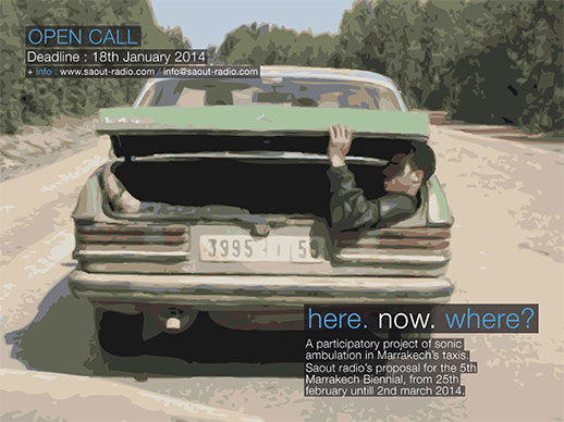 here, now, where? is a sonic urban ambulation, proposed by artists Younes Baba-Ali and Anna Raimondo, for the sound and radio art platform Saout Radio. Following an international open call, and at Saout Radio’s invitation, a collection of soundscapes from different sensibilities, languages and formats will be diffused inside local taxis during the first week of the 5th Marrakesh Biennial (from 25th of February to 2nd of March 2014). In resonance with both Henri Lefebvre’s “right to the city“ and the Biennial’s proposal “Where are we now?“, Saout Radio poses the question of delocalisation in the present moment through the experience of listening in the urban space.
