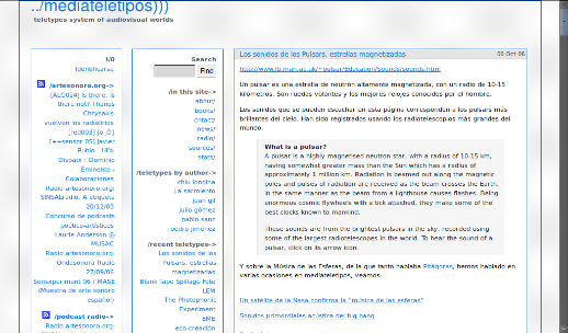 Allá en 2005-2006, ya con banda ancha en casa, bueno, el acceso a información dejó de ser un problema para mí. Descubrir webs como artesonoro.org y su hermana mediateletipos.net, me ofreció un alijo de datos, enlaces, pero también de crítica y de reflexión que han sido fundamentales en lo que he aprendido y sigo aprendiendo sobre esto. En concreto, en mediateletipos tuve mi primer contacto con los mapas sonoros que producía el colectivo Escoitar, conocí proyectos como SoundTransit, tuve mis primeros conocimientos de técnicas de grabación y tipos de microfonía, aprendí sobre la historia de la fonografía, conocí autores, colectivos, textos, proyectos que han significado mucho para mí.