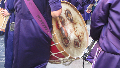 Aunque es relativamente sencillo pensar el uso de la corneta, que como tuba aparece en las representaciones de la pasión desde antiguo, no es tan sencillo pensar en el tambor en esta escena.