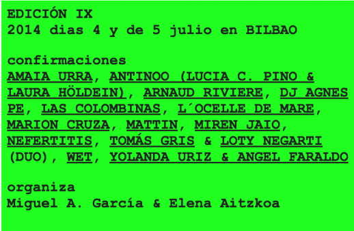 AMAIA URRA, ANTINOO (LUCIA C. PINO & LAURA HÖLDEIN), ARNAUD RIVIERE, DJ AGNES PE, LAS COLOMBINAS, L´OCELLE DE MARE,MARION CRUZA, MATTIN, MIREN JAIO,NEFERTITIS, TOMÁS GRIS & LOTY NEGARTI(DUO), WET, YOLANDA URIZ & ANGEL FARALDO