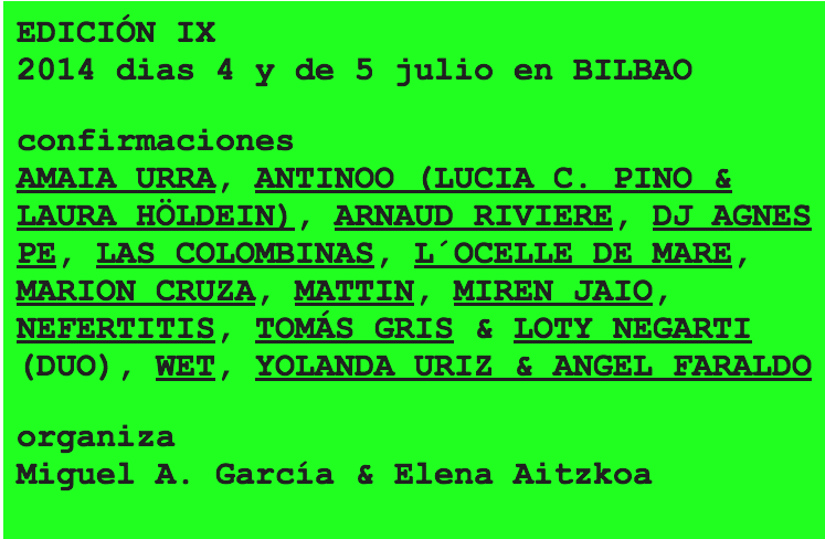 Si eres usuaria de Tableton live, Puredatista/Maxipedista, Cracker del codigo sonovisual, laptopista en general, este no es tu festival , lo sentimos este año toca de nuevo sacar la artilleria pesada, platos, radios de onda corta, drum machines, guitarras afiladas, voocoders, cacharrerismo, magnetos, video8, casssetes y demas máquinas viejunas y ruidosas, (vieja escuela)