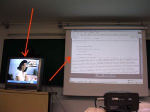 Se puede decir que este es mi profe (foto), si, si, así como lo digo, sin más. Y me explico: tenemos tantos profes como asignaturas y en algunas se reparten el temario entre dos. En total habrá 15 personas que de momento hemos conocido a través del sistema de la foto. Se trata de clases remotas en tiempo real y a través de videoconferencia con un sistema por el que las universidades han pagado mucho dinero pero que si tenéis interés en montarlo no es necesario más que un par de cámaras de video, un ordenador, el programa netmeeting y habilitar el escritor remoto en ambos ordenadores. Para el ancho de banda es suficiente con 192kbs (como tenemos nosotros), eso si, tienen que ser constantes y no en picos (en la Red Iris de la universidad no existen estos problemas, con deciros que me bajé el último cd-live de Debian en 8 minutos -630mb- ya lo digo todo). Las clases son por las tardes de 16 a 21.30 (carajo!!!) y los profes se sientan en sus aulas remotas y nos dicen cositas como: «buenas tardes chicos, vamos a comprobar en los próximos dos minutos las condiciones del sistema: ¿Talavera, me oís y me veis?, ¿podéis ver en la pantalla mi escritorio?» y así con todas las aulas de Castilla la Mancha: Ciudad Real, Albacete, Puertollano, Toledo, Talavera y, claro, Cuenca. Yo me he convertido en una especie de delegado de alumnos no-oficial y me encargo de contestar: «Aquí Cuenca, llevamos copia, QSL, al habla Charlie Alfa Romeo Lima Oscar Sierra (que viene a decir: «aquí Carlos, te escuchamos y te vemos») (ay! que me parto!!!), y ocupo este papel porque soy el que más controlo de cacharrada, (claro, es casi mi oficio) y les consigo apuntes de puta madre y recursos electrónicos y movidas de ese tipo, total, que me siento directamente delante del ordenador de Cuenca y arranco el sistema. Los profesores (algunos desde la complutense) son algo tímidos y no miran directamente a cámara, como hacía Leticia, por ejemplo (pensaba poner de ejemplo a Milá, pero me queda mejor la princesa, que desde que estuvo en Cuenca esto es una revolución). Este es el caso de Débora, la profe de Historia de la Antropología que veis en la tele. A veces se levanta para señalar algo en la pantalla y vemos que lleva unos vaqueros puta madre y casi se le ve el culo, así, tipo hip-hop, os lo juro (que no me lea, por dios, que es total esta mujer). Cuando quiere hablarnos de algún autor de pronunciación difícil (como Malinowski), lo escribe en su ordenador y nosotros lo vemos en la pantalla proyectada (la de la derecha), ahí también coloca los esquemas, las fotos y todo lo que se le ocurra. El sistema permite intervenir a la vez desde todos los campus, es decir, podemos hablar y discutir todos a la vez, pero es un cristo, así que la cosa va por turnos. Para hablar pulsamos un botón gigante (como un micro que nos pasamos entre todos) y automáticamente salimos en la pantalla del profe (es como un realizador automático que va cambiando de cámara según convenga, esto es, cuando hablan los de Toledo, los vemos todos en nuestras pantallas, y cuando contesta el profesor, se funde la imagen con la anterior, esta bien el cacharro).