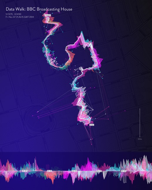 La imagen que abre el post es un mapa del paisaje inalámbrico del entorno de la BBC Broadcasting House. Las señales de red más intensas se muestran con formas más amplias, y los colores se corresponden con el canal de retransmisión del router. La pista de sonido es el mismo entorno escuchado a través de la interfaz de sonificación de Phantom Terrains. Podéis encontrar más explicaciones en la página web del proyecto.