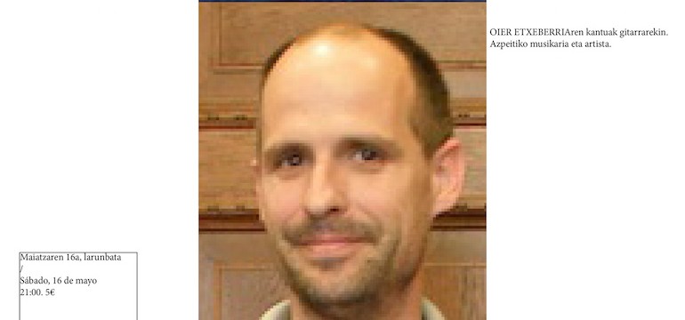 Oier Etxeberria (Azpeitia, 1974) es músico y artista visual. Ha sido miembro de Akauzazte y del proyecto Amatau TV, y entre sus exposiciones destacan: «Pure Data (Hamar)» (dentro del proyecto «Tratado de paz», 2013) y «LaLana» (en el centro Cultural Montehermoso, 2011). Ha sido codirector de proyectos como «Periferiak» (2007-2008) o «Hirugarren Belarria» (El tercer oído) (2010-2013). Responsable de proyectos expositivos como «Las Patatas y Las Cosas. Lurpeko Istorioak» (2011) y «The End (Naturaleza y Profecías)» (2012), en la Fundación Cristina Enea de Donostia-San Sebastián.