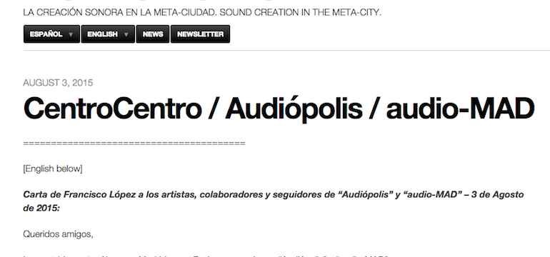 Desgraciadamente, en la situación actual, y por las razones expuestas, por convencimiento, principios y lealtad, me veo en la obligación moral de renunciar a mi modesto papel de organizador-comisario de estas actividades y de terminar, por consiguiente, estos proyectos que creé junto a Tono. Pretendo cumplir mis compromisos pendientes – ya programados y organizados – con (y por) los artistas invitados para este año 2015 en “Audiópolis” (eventos en Septiembre y Noviembre) y “audio-MAD” (artistas hasta Diciembre); una vez cumplidos éstos, terminará mi tarea en CentroCentro.