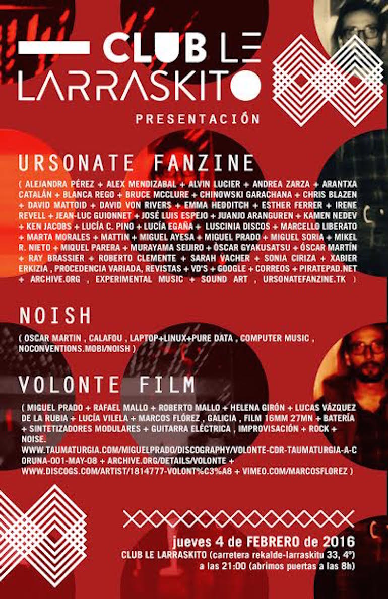 Alejandra Pérez, Alex Mendizabal, Alvin Lucier, Andrea Zarza, Arantxa Catalán, Blanca Rego, Bruce McClure, Chinowski Garachana, Chris Blazen, David Mattoid, David Von Rivers, Emma Hedditch, Esther Ferrer, Irene Revell, Jean-Luc Guionnet, José Luis Espejo, Juanjo Aranguren, Kamen Nedev, Ken Jacobs, Lucía C. Pino, Lucía Egaña, Luscinia Discos, Marcello Liberato, Marta Morales, Mattin, Miguel Ayesa, Miguel Prado, Miguel Soria, Mikel R. Nieto, Miquel Parera, Murayama Seijiro, Òscar Gyakusatsu, Óscar Martín, Ray Brassier, Roberto Clemente, Sarah Vacher, Sonia Ciriza, Xabier Erkizia