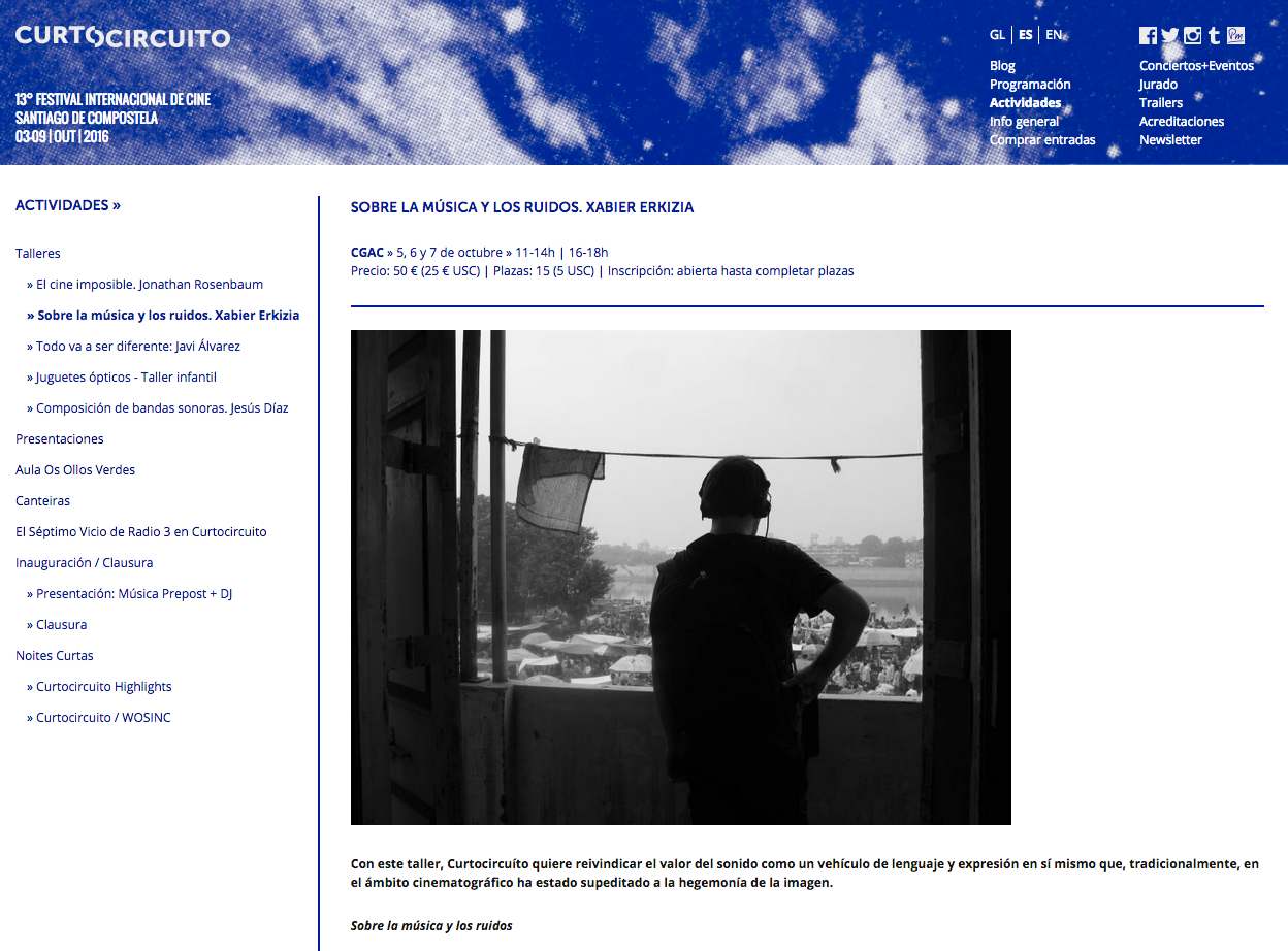 Sobre la música y los ruidos / Xavier Erkizia – «Con este taller, Curtocircuíto quiere reivindicar el valor del sonido como un vehículo de lenguaje y expresión en sí mismo que, tradicionalmente, en el ámbito cinematográfico ha estado supeditado a la hegemonía de la imagen […] Este taller propone una situación de análisis teórico-práctico del uso del sonido como herramienta narrativa en el lenguaje cinematográfico. A través del análisis de películas y de diferentes usos en obras audiovisuales (documental, ficción, animación), intentaremos comprender las claves de escucha que activamos a la hora de enfrentarnos a una obra audiovisual y las relaciones que establecemos con esta través de esas claves».