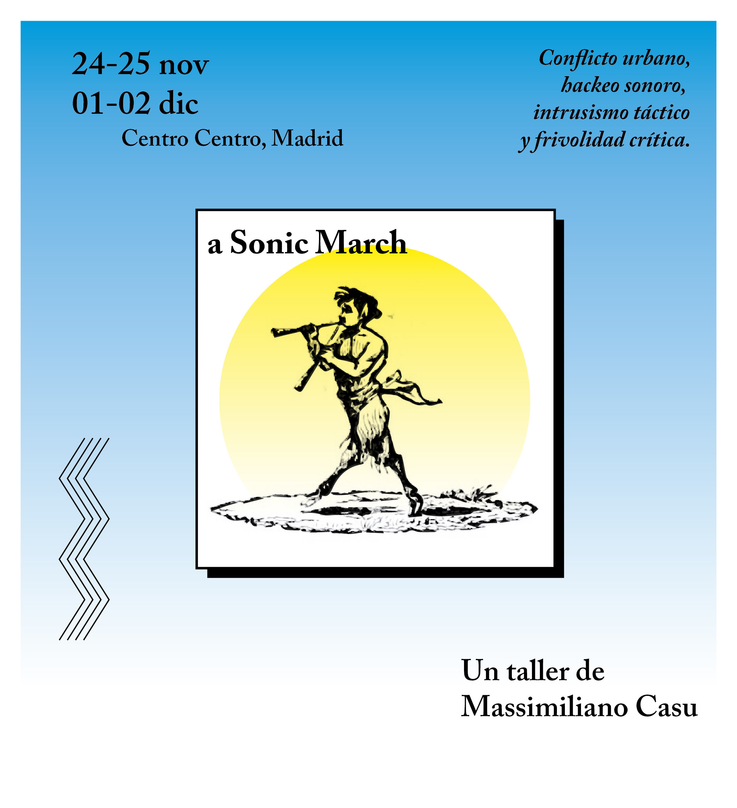 A Sonic March es un laboratorio de creación colectiva en torno a los sonidos que definen nuestro lugar en el mundo, que trazan un círculo pulsante a nuestro alrededor y que nos permiten ubicarnos en un centro estable, excluir o incluir el otro, así como dibujar fronteras que friccionan y, a veces, se funden con las demás. Es un elogio de los territorios sonoros en disputa, de la controversia aural como espacio social en el que se despliegan fuerzas, intencionalidades, deseos y subjetividades en busca de acuerdo. Propone una intervención en el espacio público a través de audios geo-localizados, con el objetivo de realizar una composición distribuida en la ciudad y escondida en las más difusas plataformas y aplicaciones para audio-guías turísticas. El objetivo del taller es realizar un recorrido crítico, en forma de instalación sonora site-specific, llevar al territorio de los locative media el espíritu de las protestas sonoras de la historia nuestras ciudades y activar una reflexión plural en torno al sonido como frontera de las disputas y las controversias urbanas.