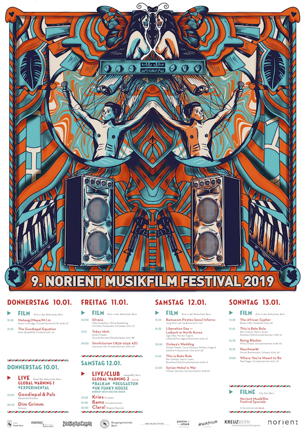 The Norient Musikfilm Festival is back. After a year off, the 9th edition will be taking place between January 10 and 13, 2019, in Switzerland (Bern, St. Gallen, Lausanne). We will be screening thirteen music films dealing with the current topics of migration, futurism, dance, tradition, cultural diplomacy, and war. The live acts and DJanes include Goodiepal & Pals, Dim Grimm (Dimlite), Kries, Clara!, and Bamz, who will offer a musical spectrum ranging from Croatian folk, political performance, and sound experiments, to UK funky house and reggaetón. This year’s festival will open with the documentary about English-Tamil world music 2.0 superstar Matangi/Maya/M.I.A., which was nominated for the Sundance Film Festival. Deutsche Version im unteren Teil.