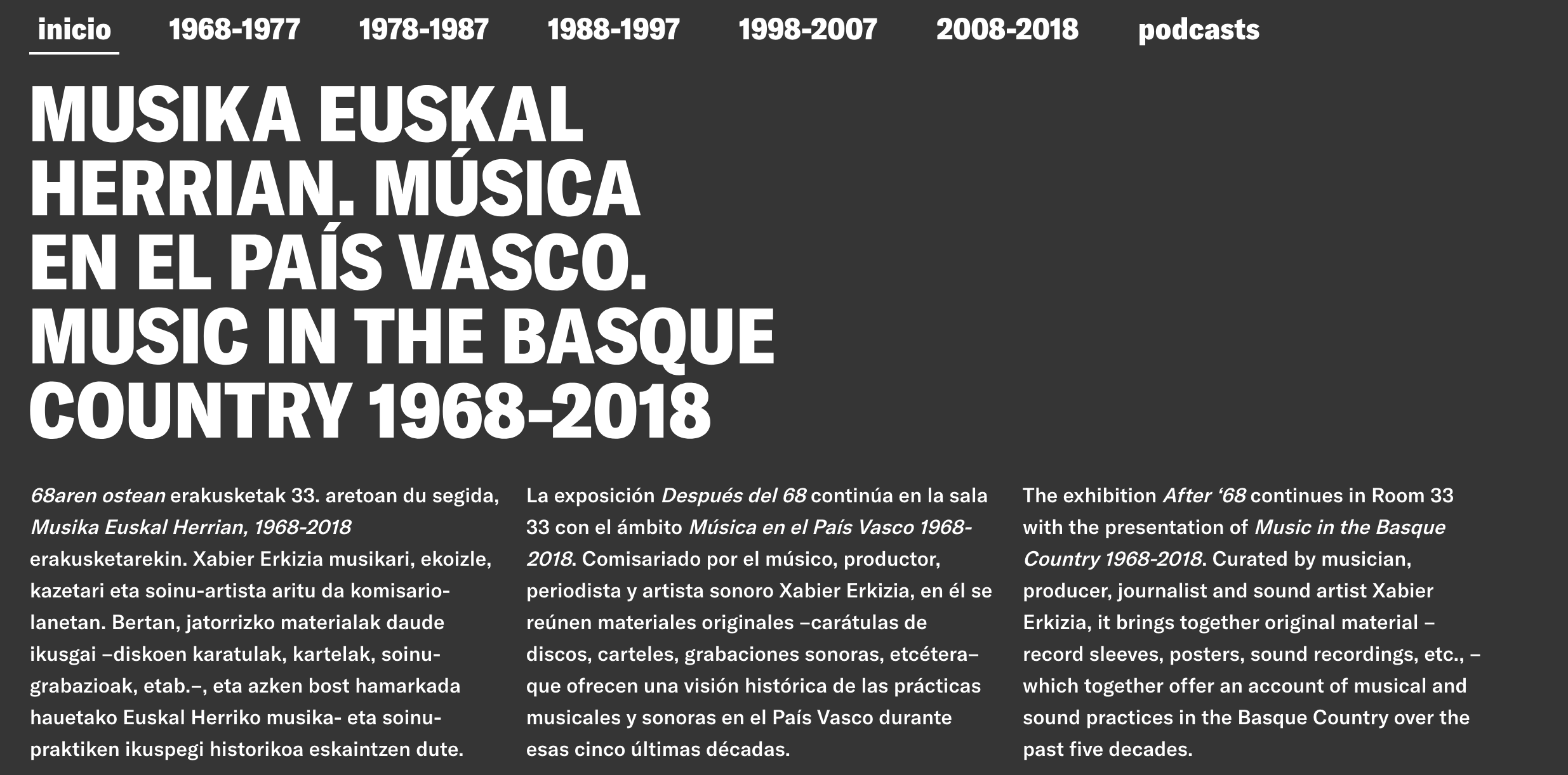 La exposición Después del 68 continúa en la sala 33 con el ámbito Música en el País Vasco 1968-2018. Comisariado por el músico, productor, periodista y artista sonoro Xabier Erkizia, en él se reúnen materiales originales –carátulas de discos, carteles, grabaciones sonoras, etcétera– que ofrecen una visión histórica de las prácticas musicales y sonoras en el País Vasco durante esas cinco últimas décadas.